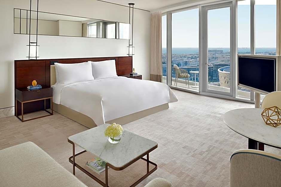 This suite features modern interiors, a seating area, a king size bed and a walk in wardrobe. The suite also offers a spacious bathroom featuring a vanity area. The suite is complemented by a private balcony overlooking the city, and the suite offers access to the Club Lounge which offer a food and beverages served throughout the day.